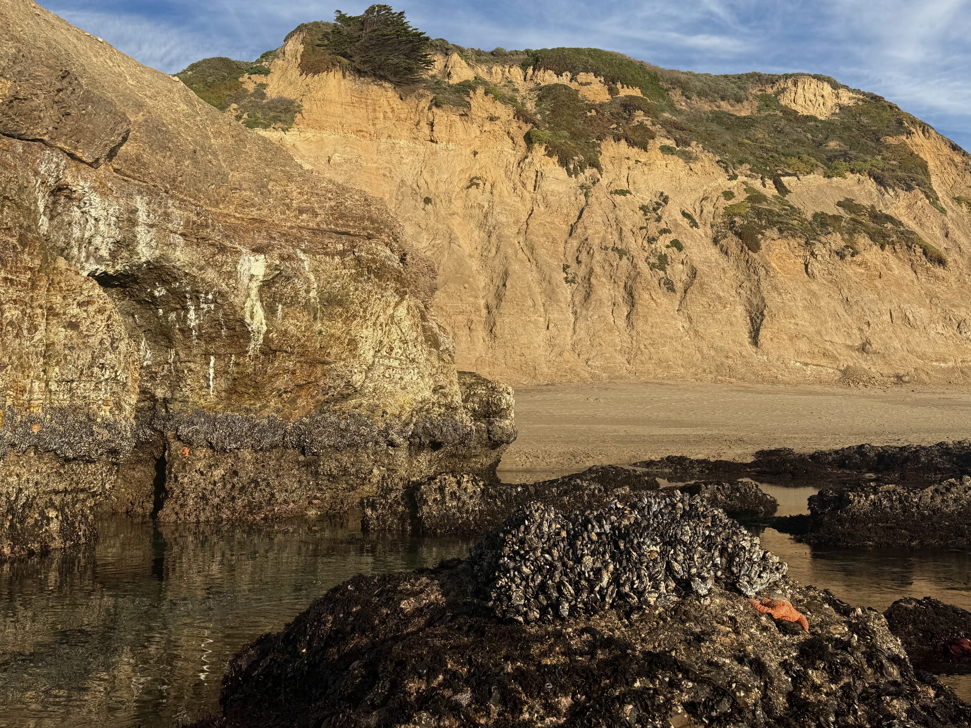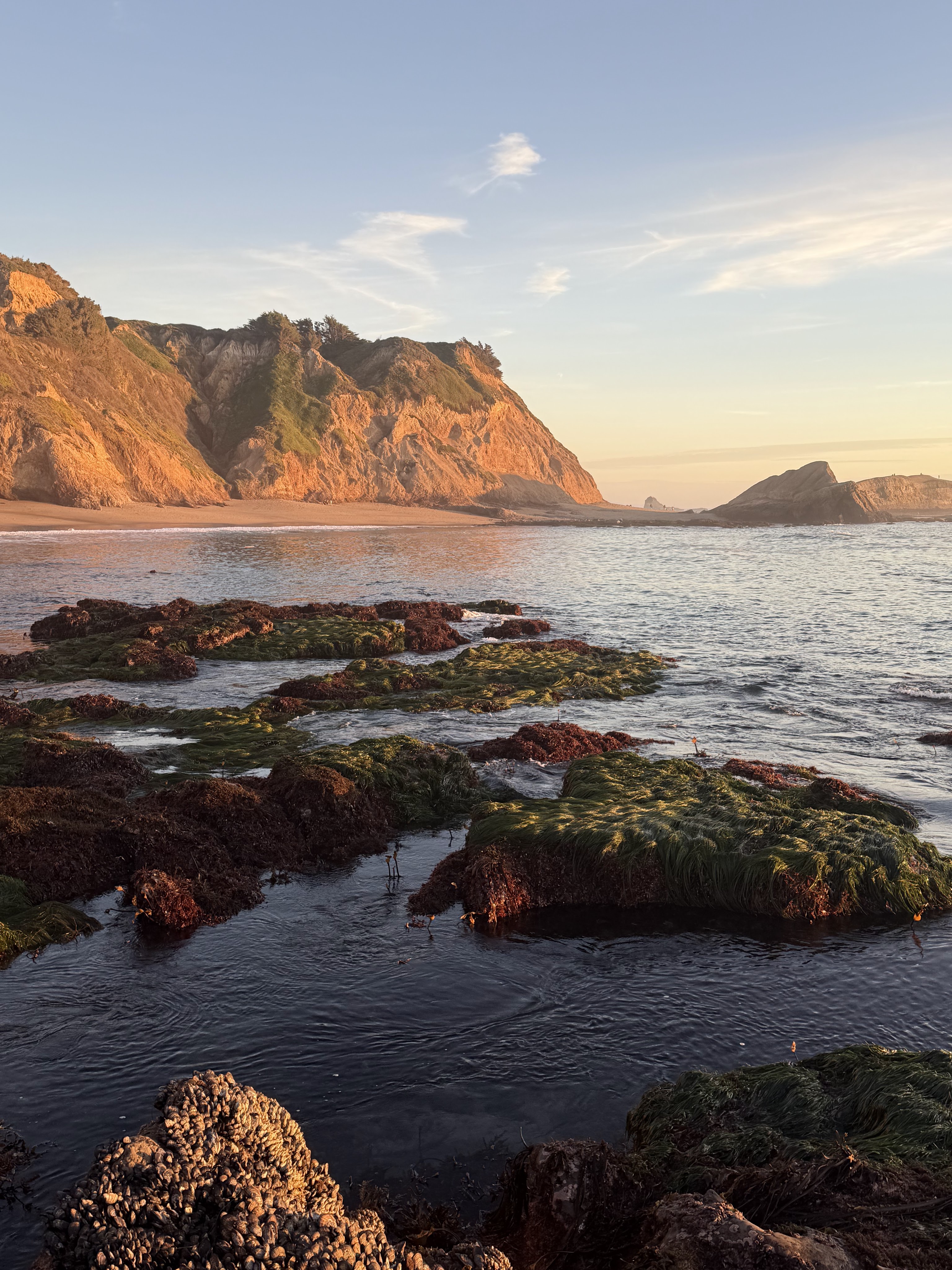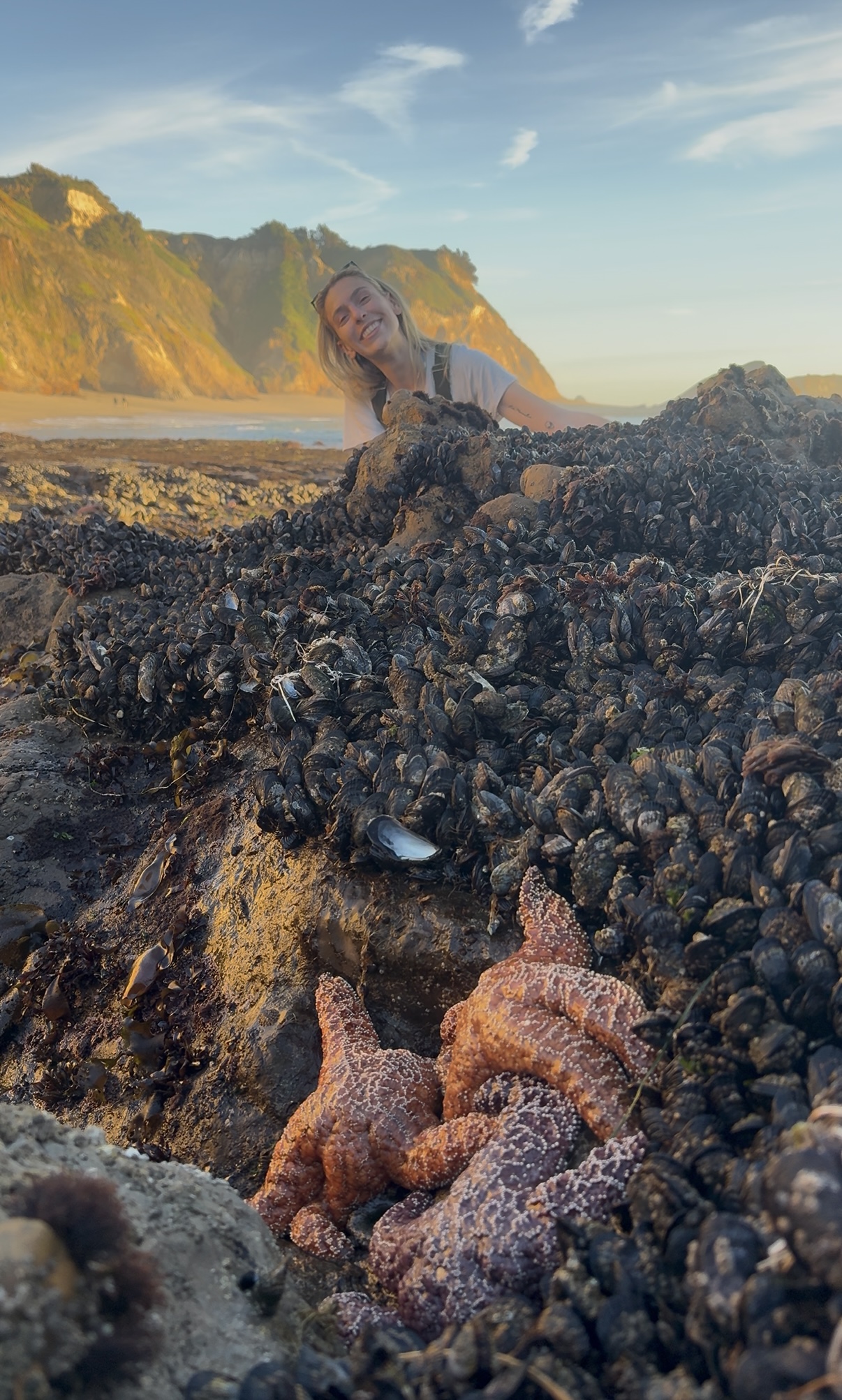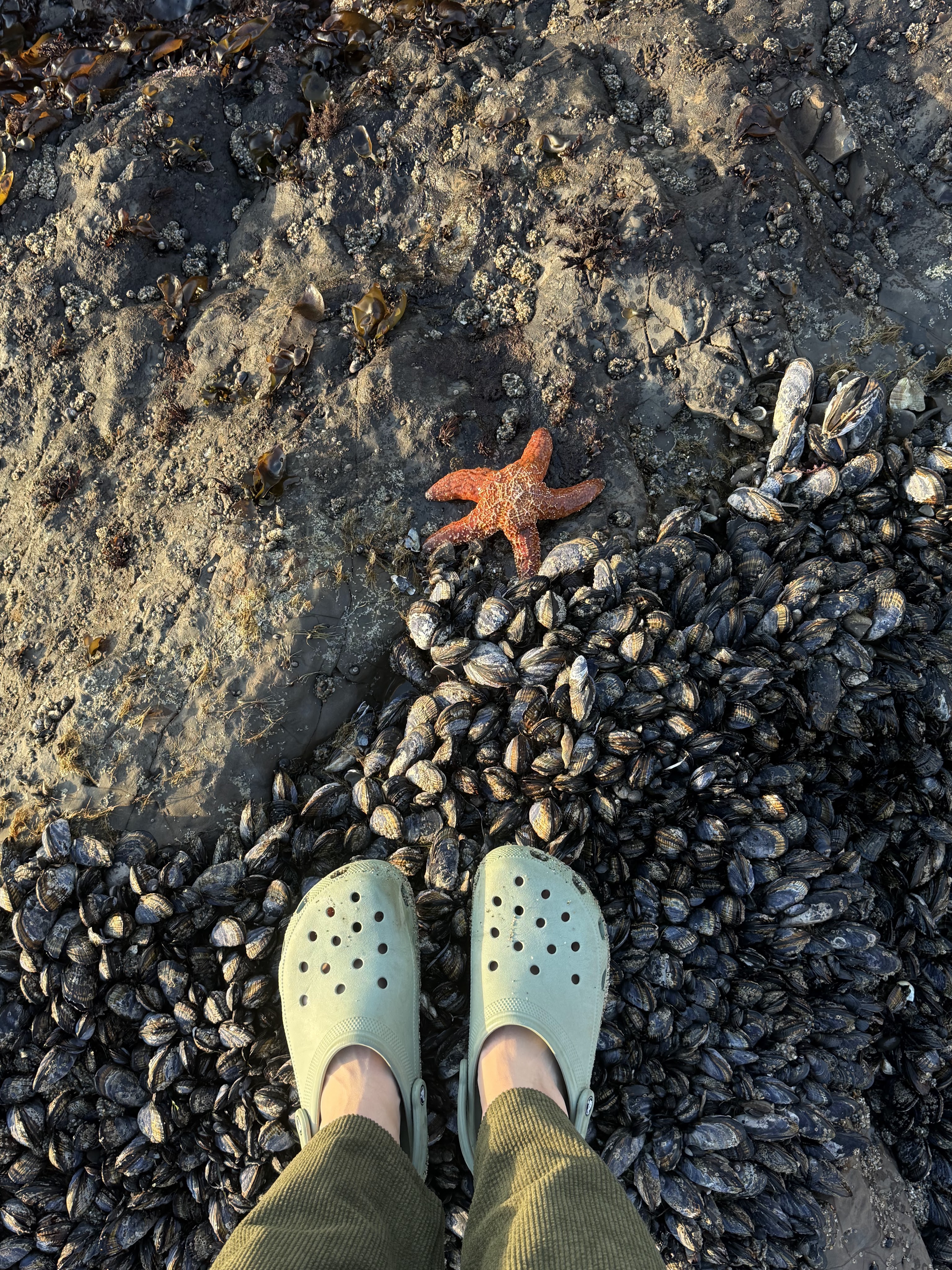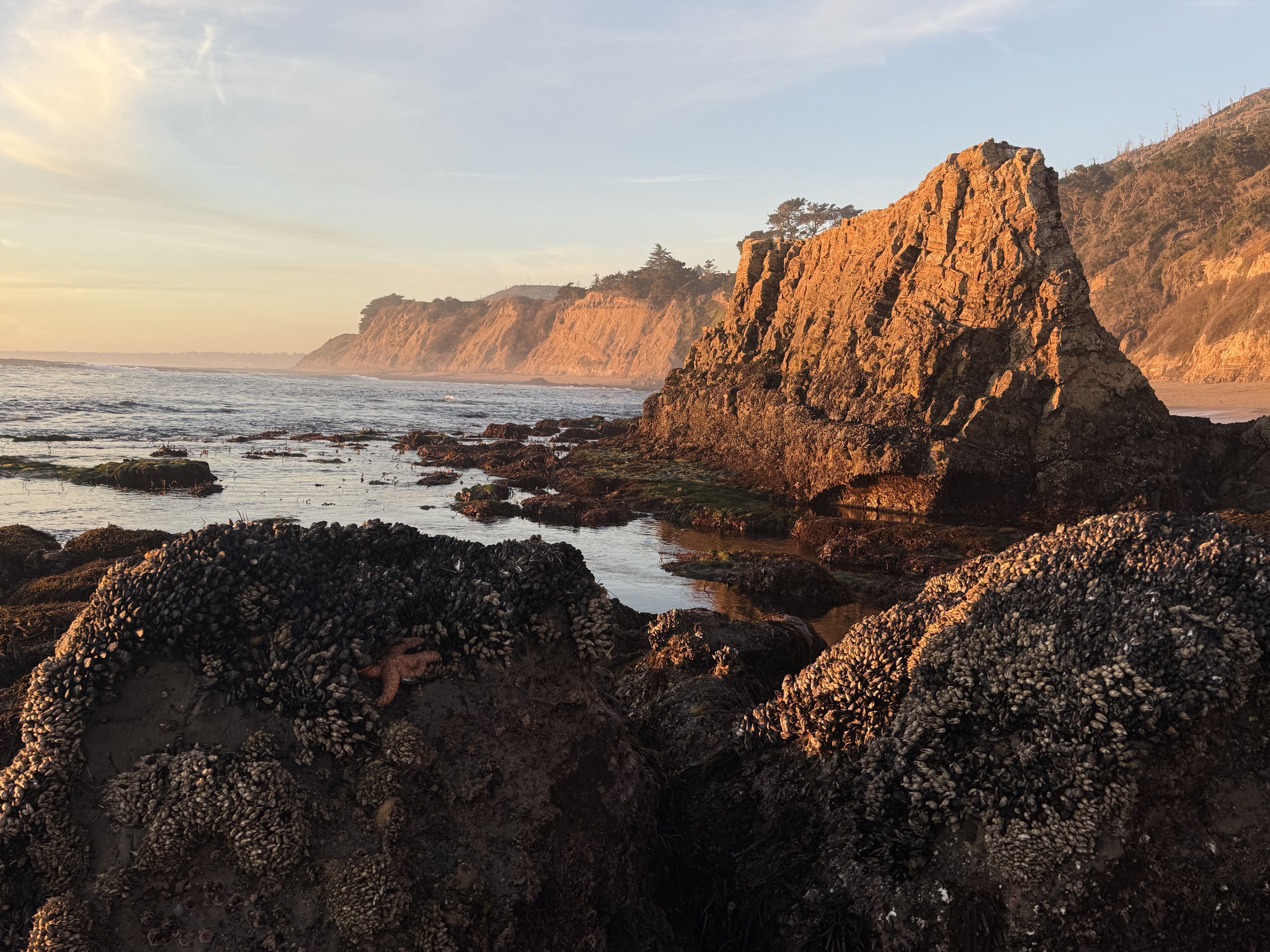 After my morning in the forest, I went to New Leaf, a great (but boujee) grocery store that is used to live next to. They have a great deli sandwich section, so I grabbed one and headed up the coast! Route 1 between Santa Cruz and Half Moon Bay is fairly rural with not a lot of homes or services, but has many places to hike, explore and swim. Depending on the time of the year, tides, and what I’m feeling, there are a lot of spots I love frequenting. Since it is January, which is not only king tide season but also elephant seal mating season when they gather around Año Nuevo State Park. You can pay to get into the park and even book a walking tour to see the elephant seals, but as someone who learned about this as a broke college student, I usually park and enter for free from Victoria Beach just South of the park entrance. You have a pretty good chance between November and February each year to see the Elephant seals around Año Nuevo, but nothing is guaranteed. This time around when I got down to the beach there weren’t any seals, but the beach is a great place to look at rocks as there are a lot of fossilized shells in the rocks there which can be very interesting to look at. As the sun started to lower, I headed to my favorite beach to look at tide pools, and not too far from Año Nuevo (I’ve also seen elephant seals at but not as often), Greyhound Rock. This beach has a parking lot with bathrooms and picnic tables, and is a popular overnight spot for vanlifers and car campers (and homeless people so just be aware, although it’s generally a hippy group). To get down to the beach there is a somewhat steep but short walk down a paved path. At the bottom of the path, from huge swells the stairs have been washed out so there are makeshift ways to get down. If you struggle with big steps down, have knee issues, or struggle with balance I would suggest having a buddy to go with to help you down that last section. Once down, there is a huge stretch of sandy beach before the cliffs that you can walk back and forth on, passing exposed tide pools along the way. The actual Greyhound Rock is easy to recognize as it’s huge and right as the bottom of the beach, the tide pools surrounding it are very popular. If you want some more seclusion, if you walk north on the beach there is another great set of tide pools not too far up. This beach has the most beautiful backdrop to looking in the tide pools. I used to come here often when in college to go and count how many starfish I could find, so I played that game with myself again. I lost count past 20 but I likely saw 40-50 starfish my first evening there.