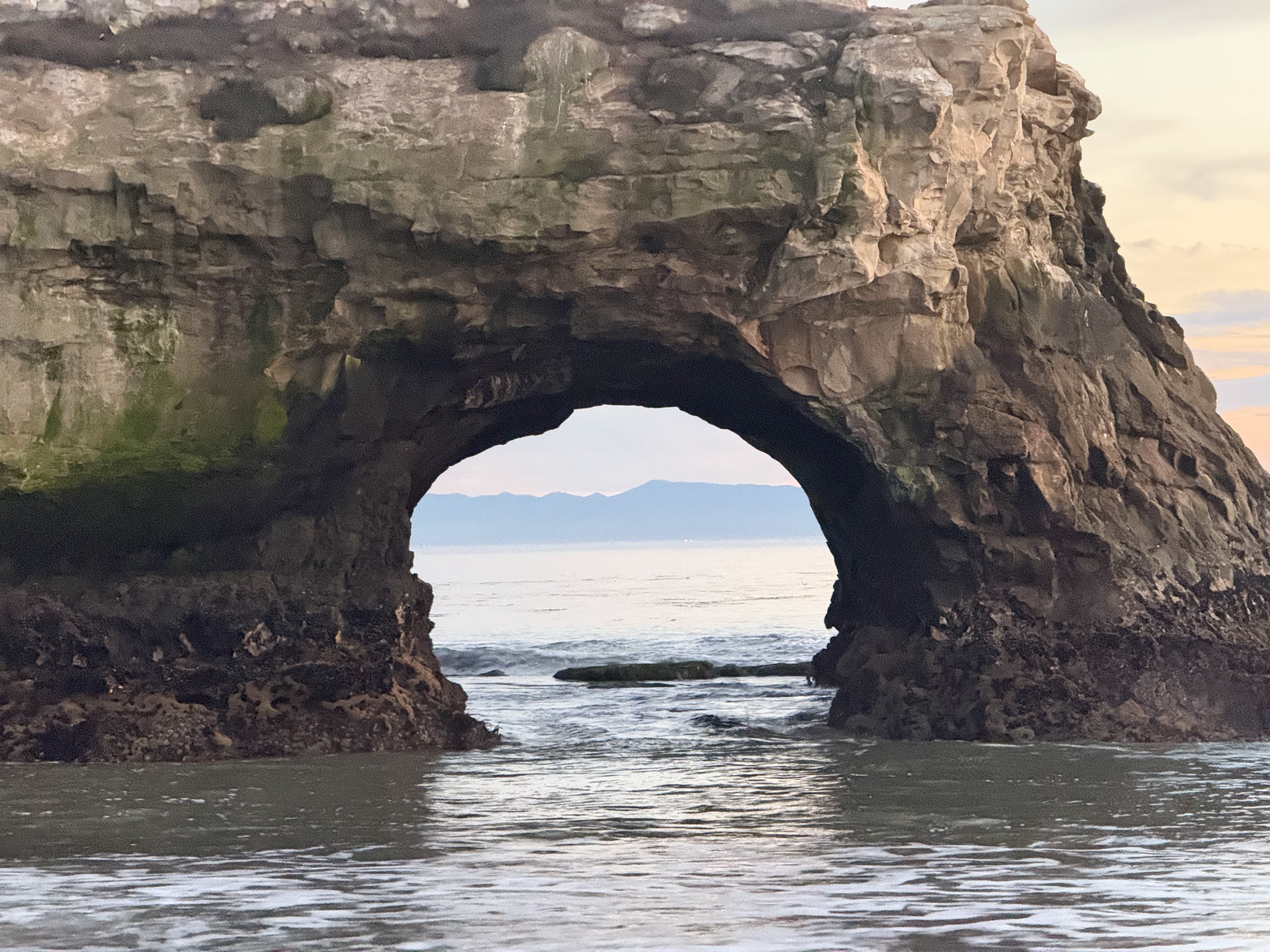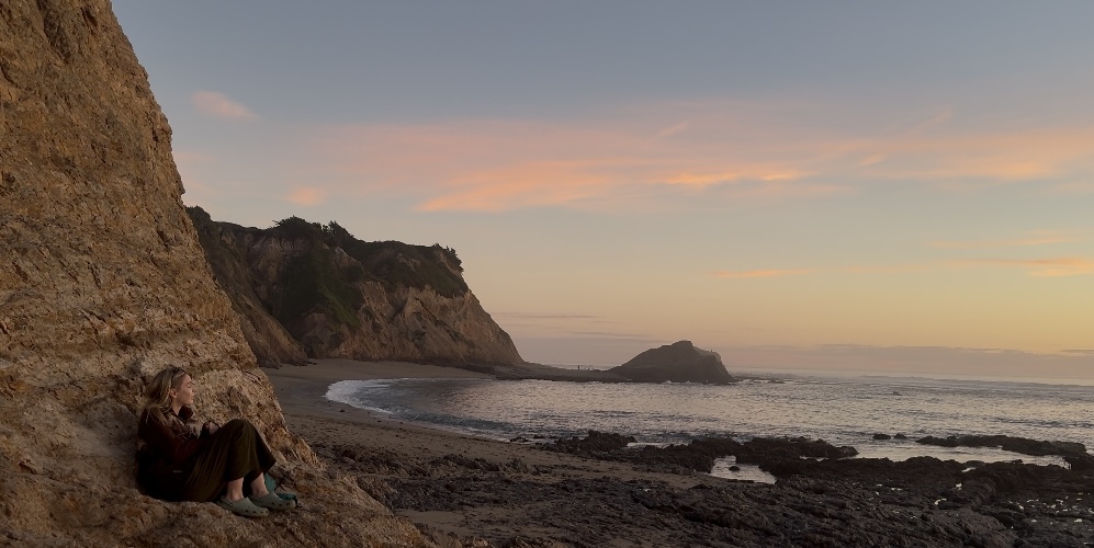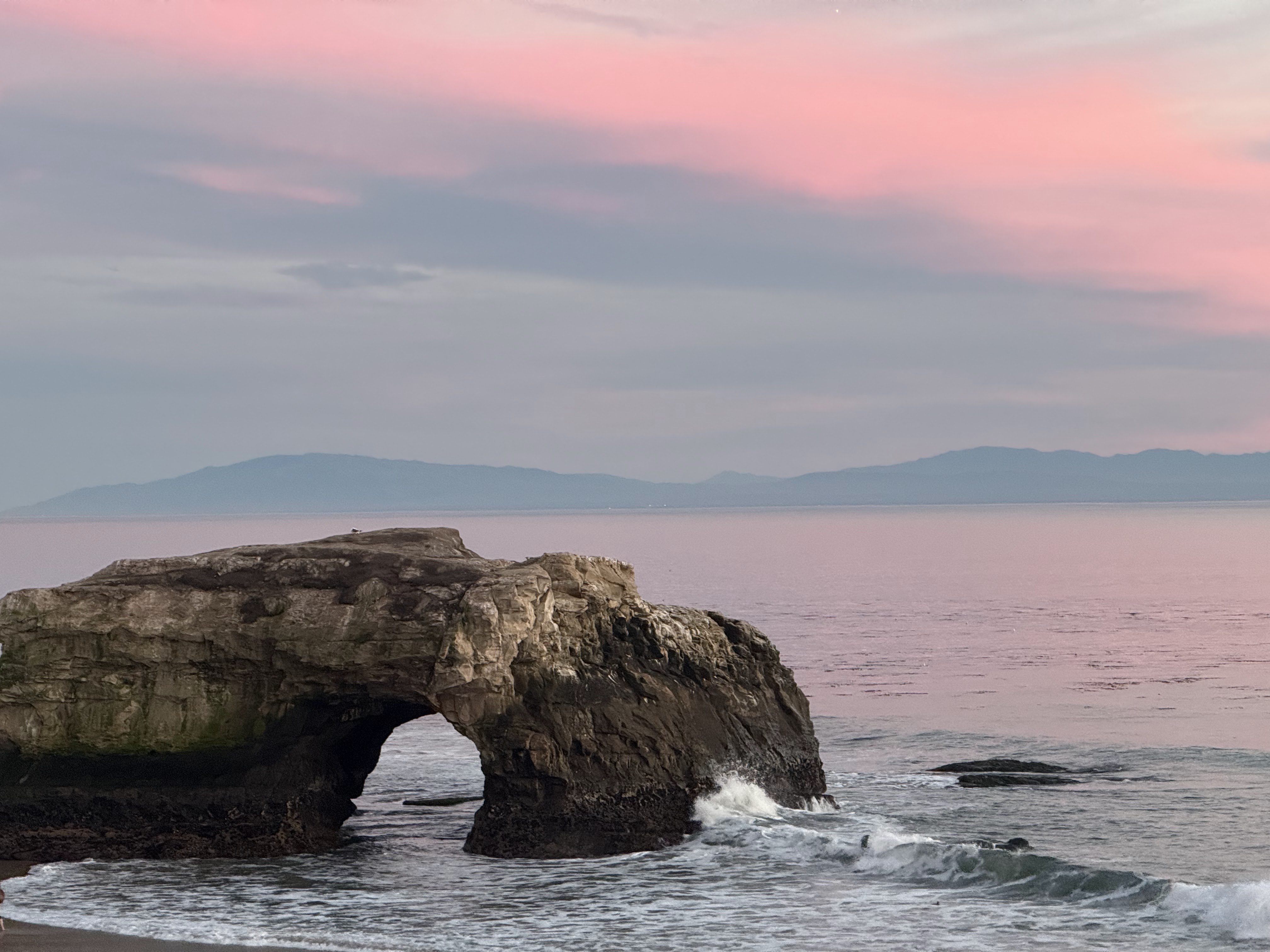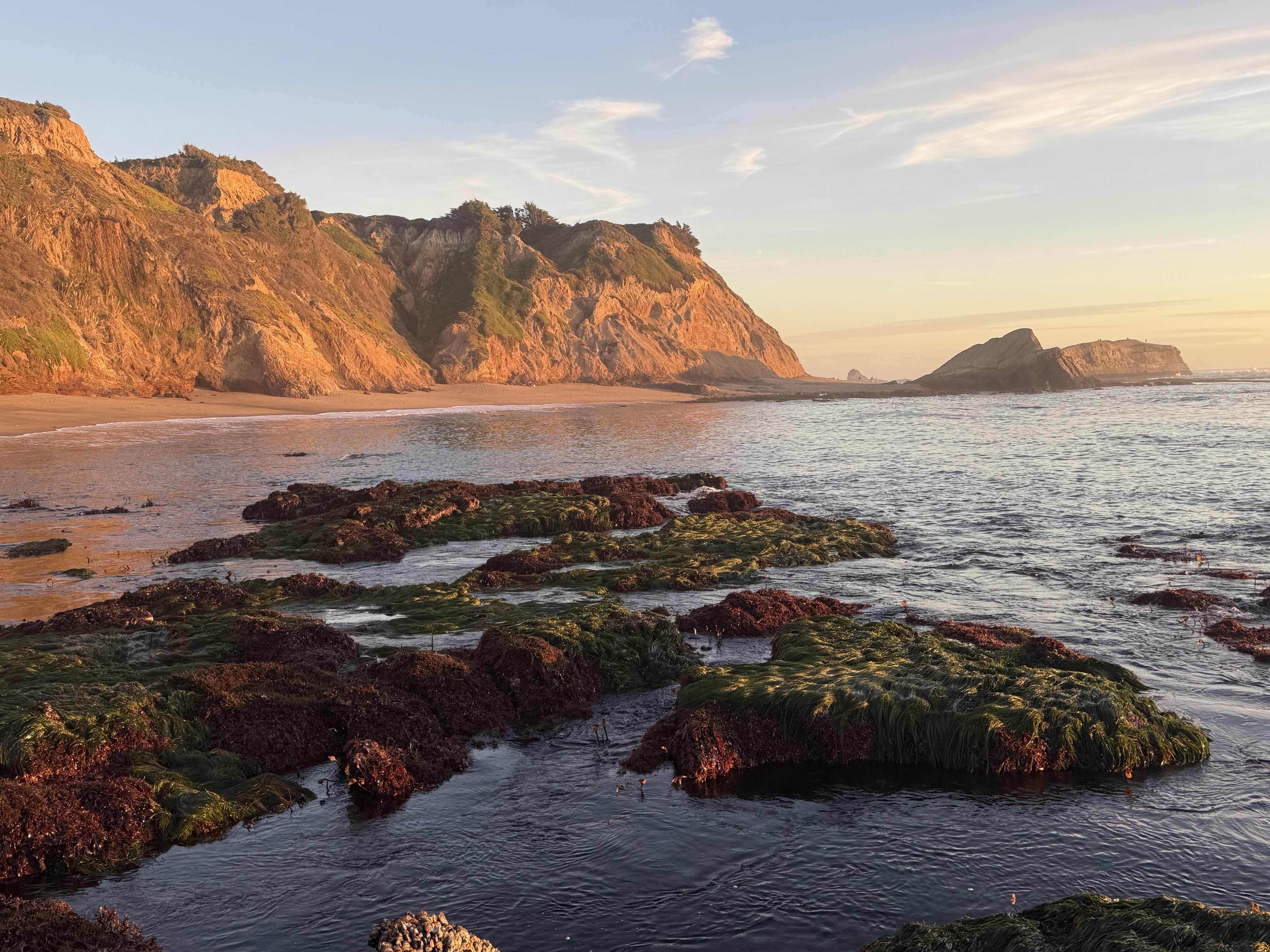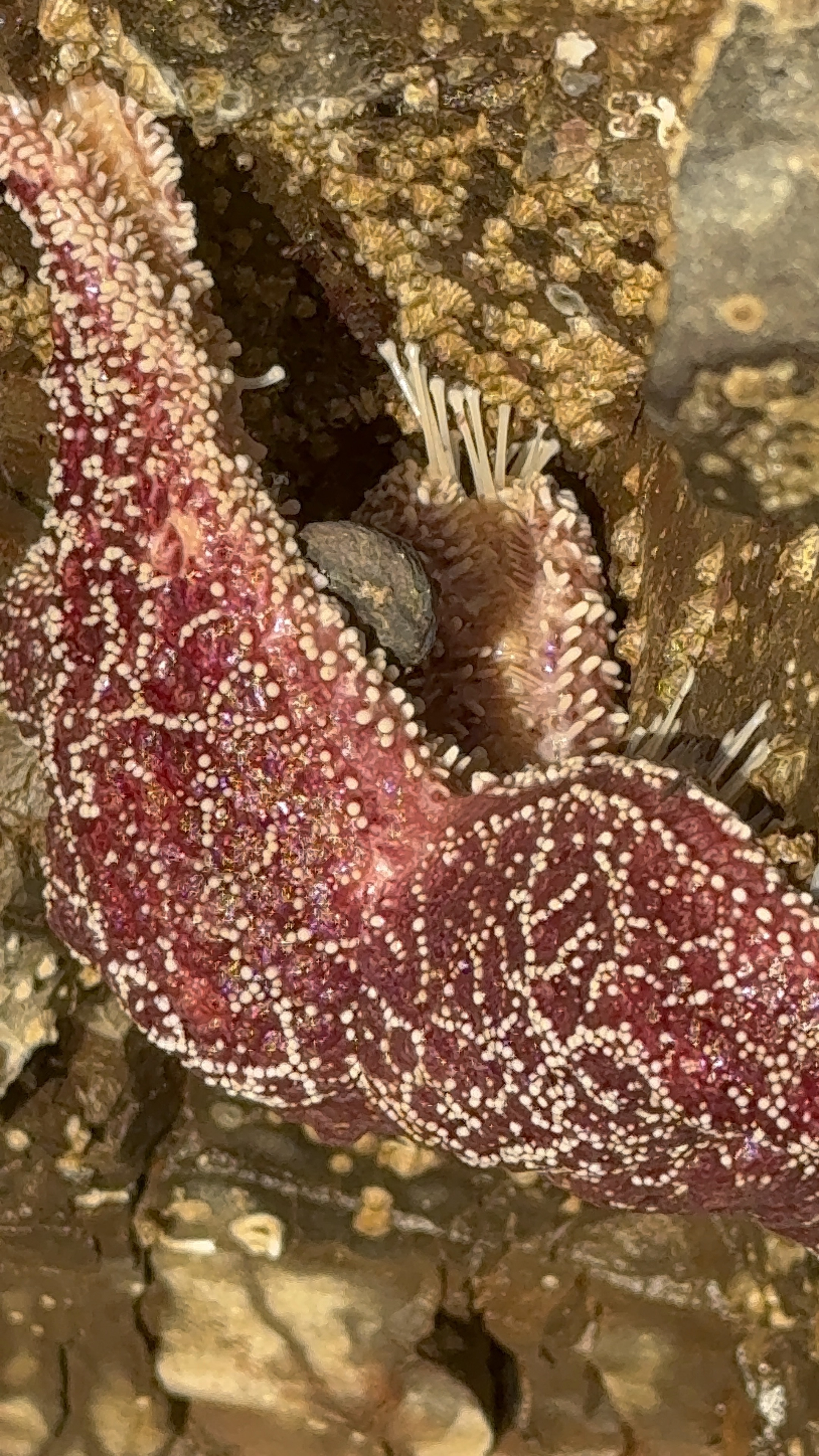 After my morning in the forest, I went to New Leaf, a great (but boujee) grocery store that is used to live next to. They have a great deli sandwich section, so I grabbed one and headed up the coast! Route 1 between Santa Cruz and Half Moon Bay is fairly rural with not a lot of homes or services, but has many places to hike, explore and swim. Depending on the time of the year, tides, and what I’m feeling, there are a lot of spots I love frequenting. Since it is January, which is not only king tide season but also elephant seal mating season when they gather around Año Nuevo State Park. You can pay to get into the park and even book a walking tour to see the elephant seals, but as someone who learned about this as a broke college student, I usually park and enter for free from Victoria Beach just South of the park entrance. You have a pretty good chance between November and February each year to see the Elephant seals around Año Nuevo, but nothing is guaranteed. This time around when I got down to the beach there weren’t any seals, but the beach is a great place to look at rocks as there are a lot of fossilized shells in the rocks there which can be very interesting to look at. As the sun started to lower, I headed to my favorite beach to look at tide pools, and not too far from Año Nuevo (I’ve also seen elephant seals at but not as often), Greyhound Rock. This beach has a parking lot with bathrooms and picnic tables, and is a popular overnight spot for vanlifers and car campers (and homeless people so just be aware, although it’s generally a hippy group). To get down to the beach there is a somewhat steep but short walk down a paved path. At the bottom of the path, from huge swells the stairs have been washed out so there are makeshift ways to get down. If you struggle with big steps down, have knee issues, or struggle with balance I would suggest having a buddy to go with to help you down that last section. Once down, there is a huge stretch of sandy beach before the cliffs that you can walk back and forth on, passing exposed tide pools along the way. The actual Greyhound Rock is easy to recognize as it’s huge and right as the bottom of the beach, the tide pools surrounding it are very popular. If you want some more seclusion, if you walk north on the beach there is another great set of tide pools not too far up. This beach has the most beautiful backdrop to looking in the tide pools. I used to come here often when in college to go and count how many starfish I could find, so I played that game with myself again. I lost count past 20 but I likely saw 40-50 starfish my first evening there.