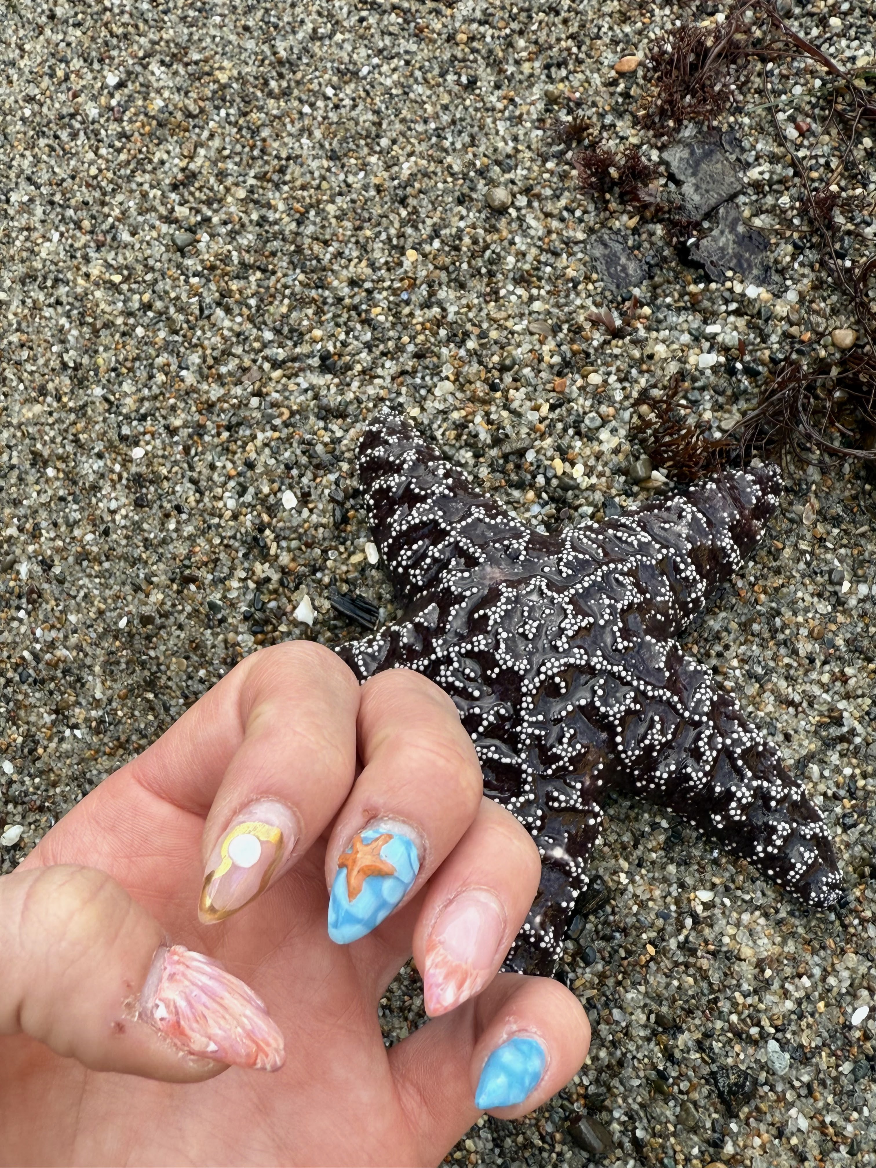 After enjoying the Garden of Eden and taking my windy drive through the redwood mountains down to the coast, I headed back to Greyhound Rock beach. As the tide is still getting lower, I went to the picnic tables off of the parking lot and made some ramen for a late lunch. Once I headed down to the beach, I knew I wanted to explore a new area of the tide pools so I walked along the beach for a while deciding where to go. Starfish only move so much in a single day so going to the same area would be seeing a lot of the same starfish and I wanted to see new ones. After going up the beach a bit I find another great section of tide pools with an insane amount of starfish, more than the ones the day before. At one point I was standing on a rock and had about 40 starfish within my field of vision. It was fantastic, and I stayed at the beach until it was dark enough to need my flashlight to get back up the trail after watching a beautiful sunset. (And yes, of course I did my nails for the tide pools). I then headed to meet some friends at one of my favorite places to get dinner in Santa Cruz, Akira!