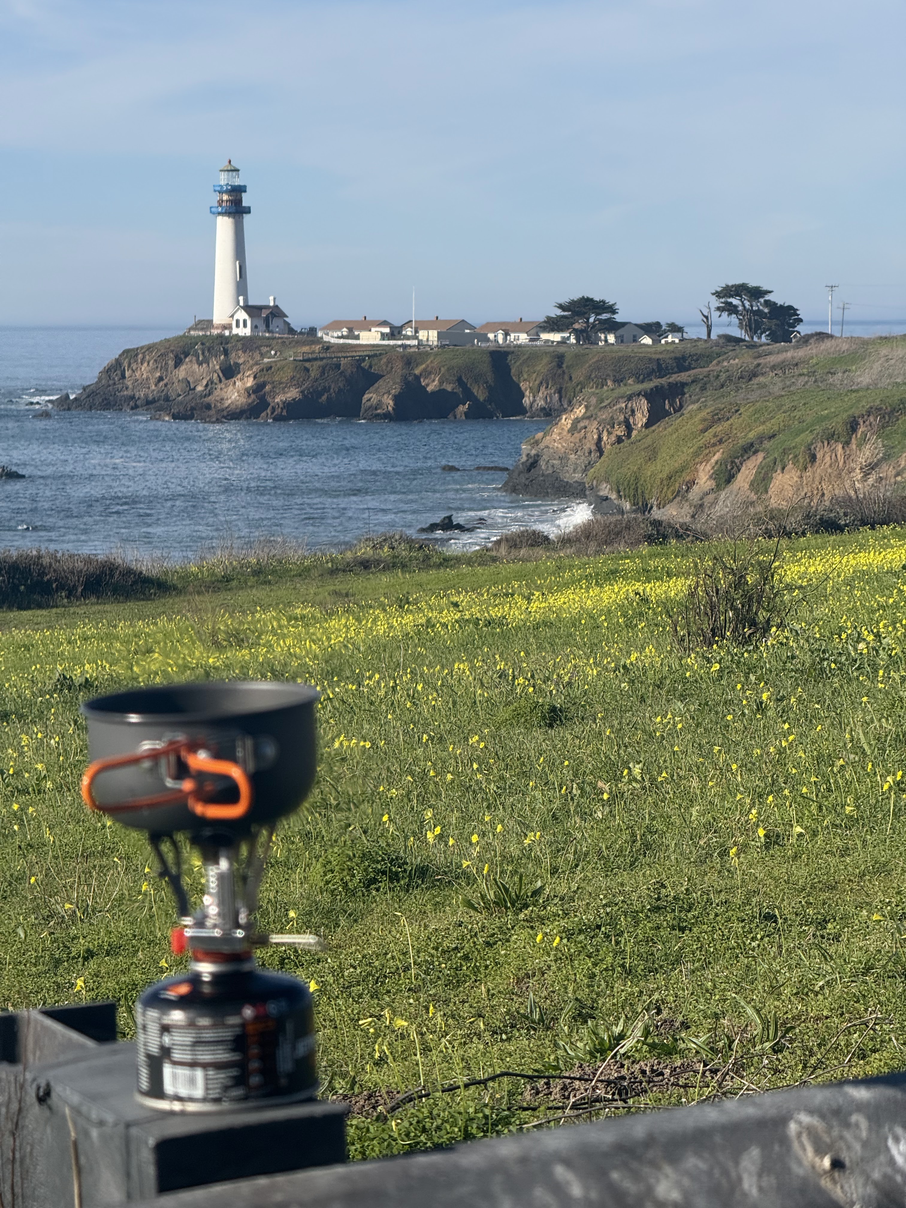 I car camped up highway 1 along the beach that night and started my next day heading to Pigeon Point Lighthouse. In January the yellow sourgrass flowers bloom like crazy along the coast leaving blankets of yellow. Near the lighthouse there are multiple areas with my flowers. I stopped to make some oatmeal for breakfast and enjoyed the view as it started to warm up.